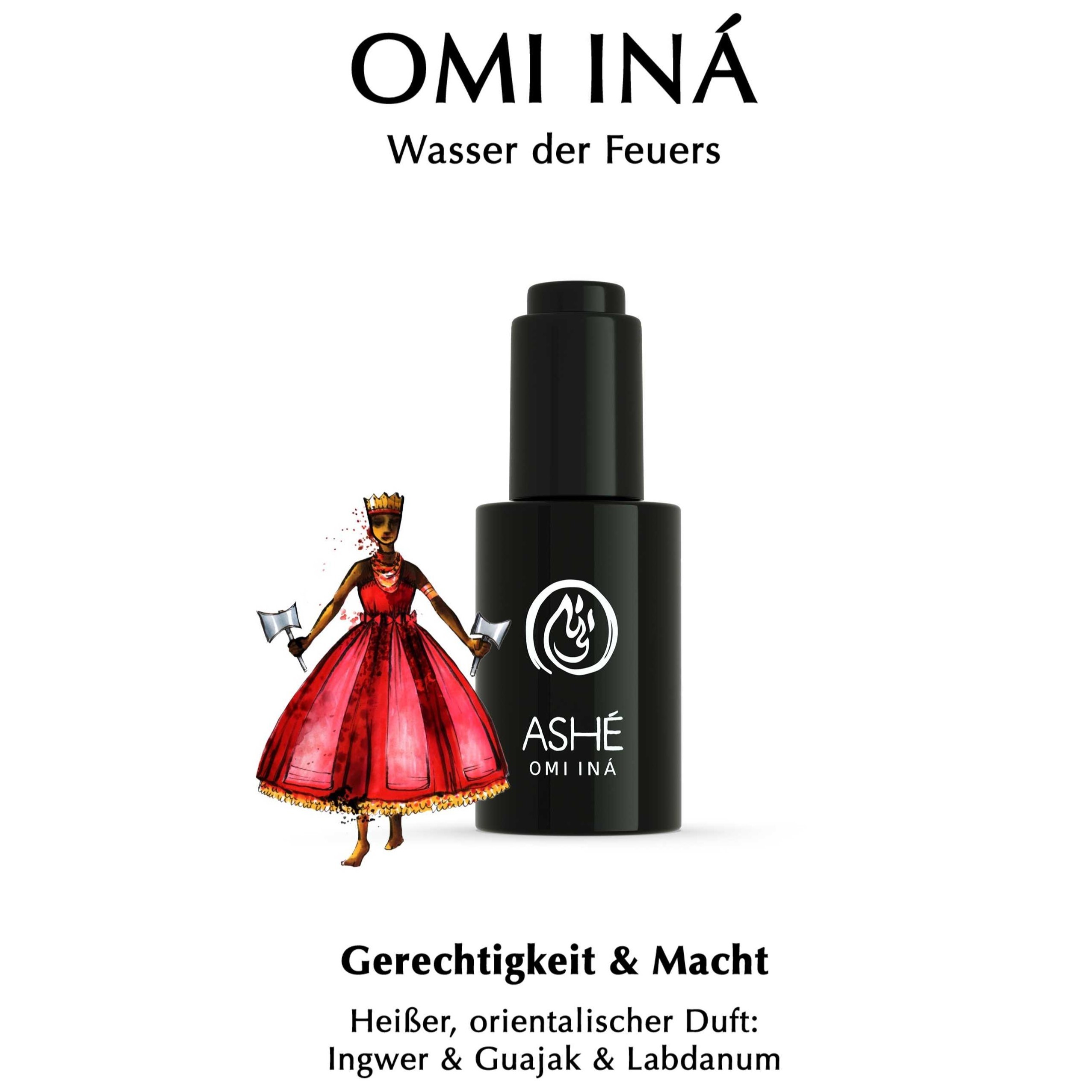 Der Duft der Gerechtigkeit. Omi bedeutet Wasser, Iná bedeutet Feuer. Hommage an den Orishá Shangô. Er ist der Orishá der Gerechtigkeit, der Hüter des Elementes Feuer.